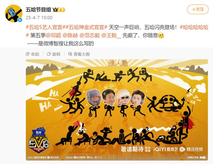 4月7日,综艺《哈哈哈哈哈》(简称“五哈”)第五季官宣嘉宾阵容,邓超、陈赫、范志毅和王勉四人继续担任“五哈团”成员。